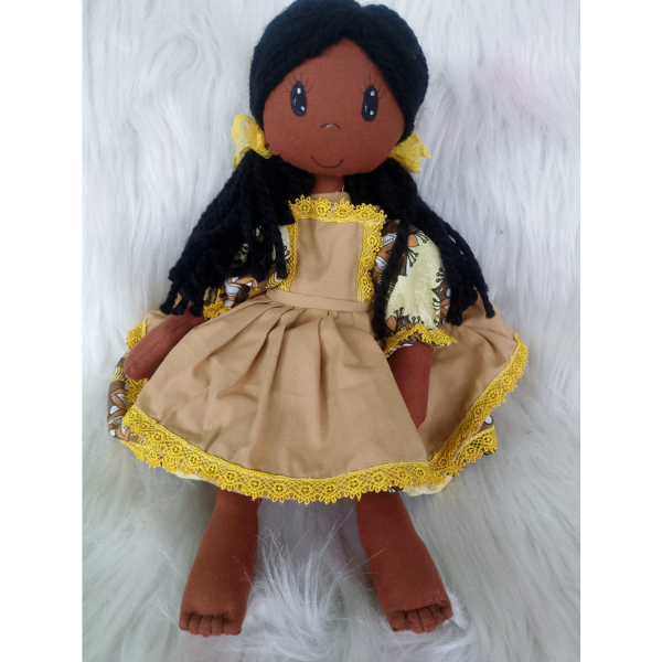 Seu cabelo é confeccionado com lã macia e seu vestidinho bege com rendas amarelas e estampas multi-tons traz o encanto das tardes no jardim.