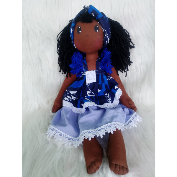 Seu cabelo é confeccionado com lã macia e seu vestidinho azul com rendas azul clara e estampas multi-tons traz o encanto das tardes no jardim.