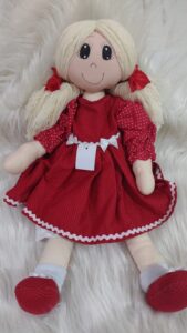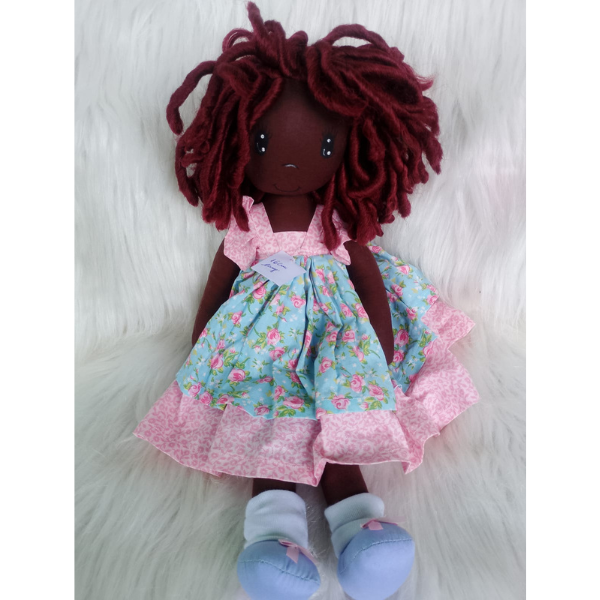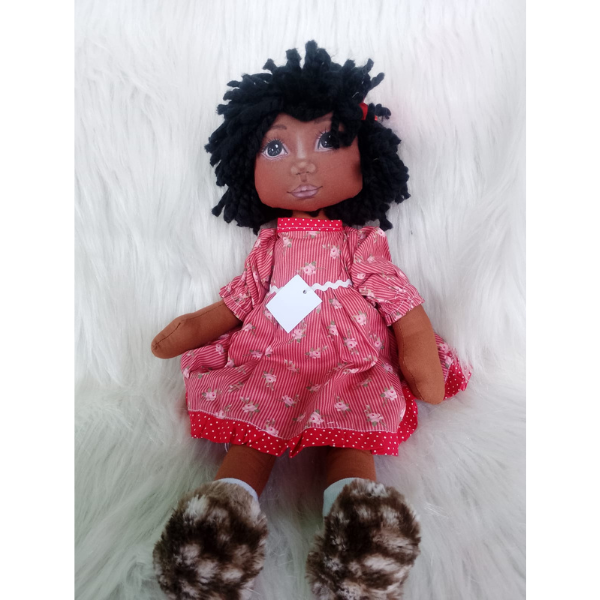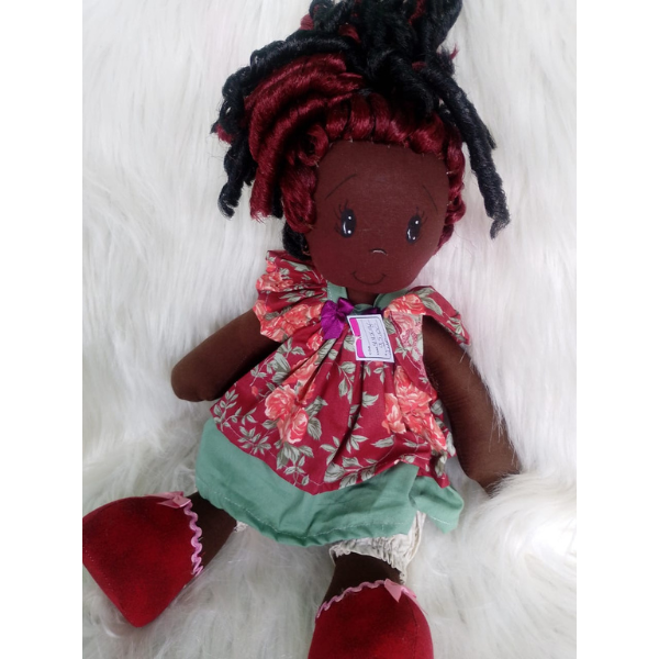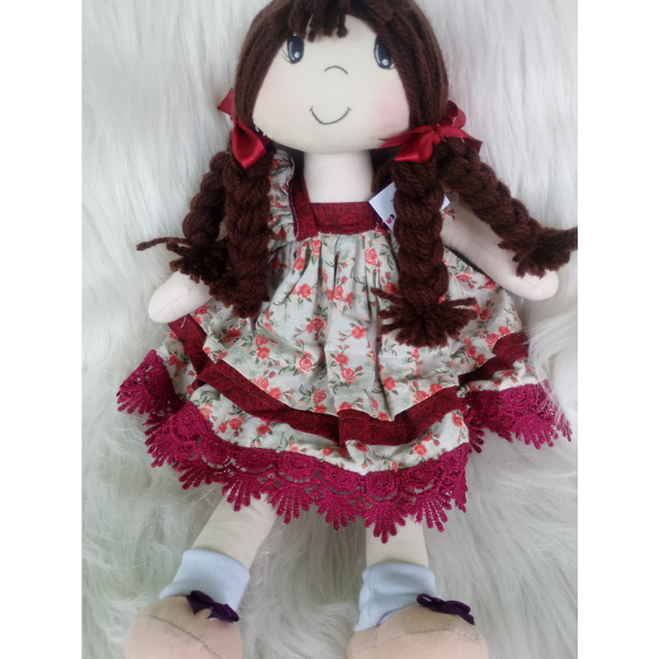 Seu cabelo é confeccionado com lã macia e seu vestidinho florido com rendas vermelhas e estampas multi-tons traz o encanto das tardes no jardim.