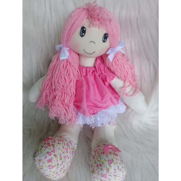 Seu cabelo é confeccionado com lã macia e seu vestidinho rosa com rendas e estampas multi-tons nos pés traz o encanto das tardes no jardim.
