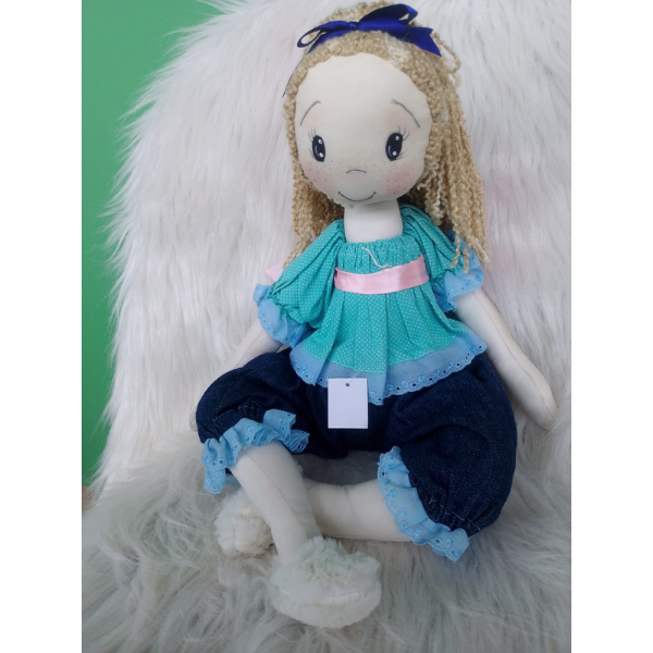 Seu cabelo é confeccionado com lã macia e sua bata verde com detalhes em azul e com rendas azuis e Bermuda jeans traz o encanto das tardes no jardim.