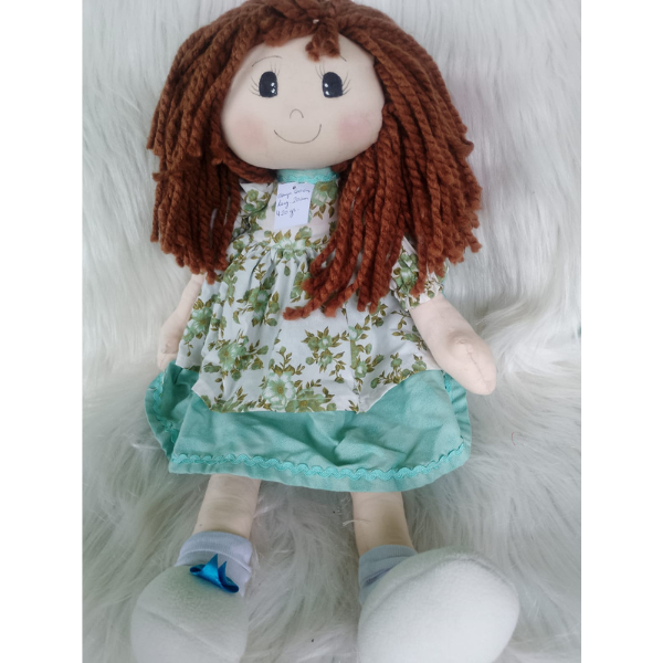 Seu cabelo é confeccionado com lã macia e seu vestidinho florido com detalhes em verde o encanto das tardes no jardim.