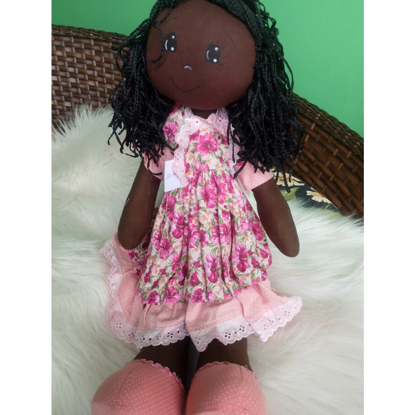 Seu cabelo é confeccionado com Kanecalon e seu vestidinho florido com rendas e estampas multi-tons traz o encanto das tardes no jardim.